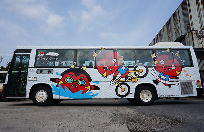 また、『バラモンちゃん』は毎年五島で開催されている五島長崎国際トライアスロン大会(バラモンキング)の大会応援キャラクターとして活躍しています。そのため、乗降口側にはトライアスロンをする様子、運転席側にはプロフィールとかっこよくポーズを決めたバラモンちゃんがいます。ぜひ同じポーズをして写真を撮ってみてください♪