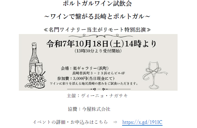かつてポルトガルの船が降り立ち、異国の文化と出会ったこの長崎の地で、ワインの魅力、ポルトガルの話、そして長崎への想いをオンラインにて語っていただきます。きっと私達もポルトガルをもっと身近に感じ好きになることでしょう!