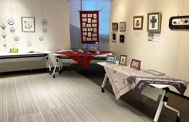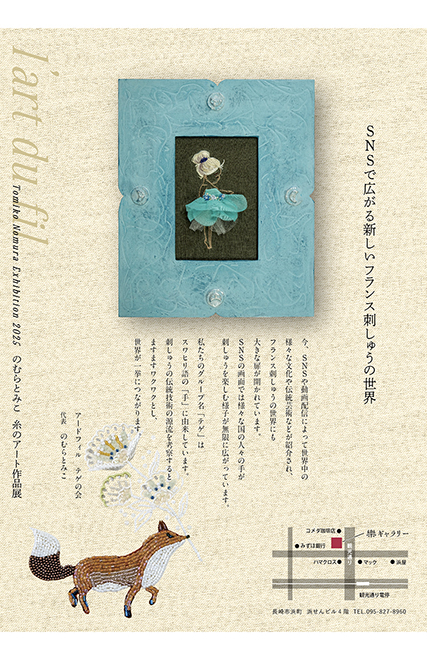 アート刺しゅう作家・のむらとみこと、その教室で学ぶ生徒たちによる作品を展示しています。