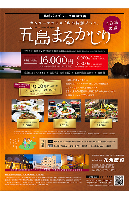 さらに、おひとり様2,000円分のミールクーポン付きで、五島の味覚も楽しめる内容です。