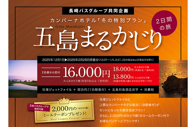 五島バスグループで利用できる おひとり様2,000円分のミールクーポン付き。