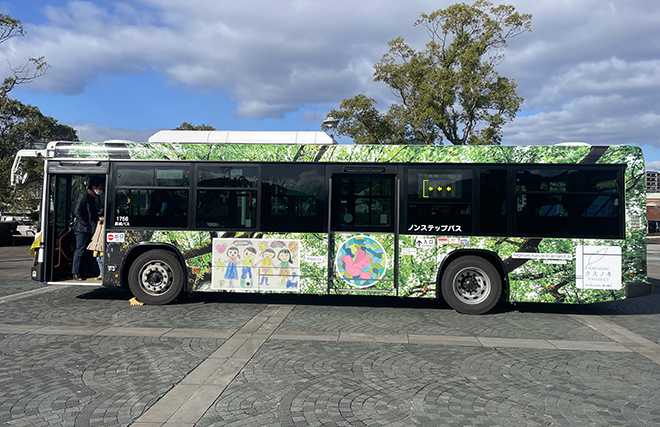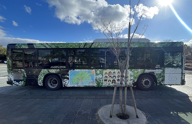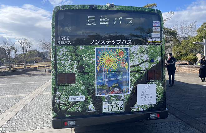 「長崎クスノキプロジェクト」では、昨年に続き、「平和のバスデザインコンテスト」を実施し、全国の小学生から『平和のバス』のデザインを募集しました。ご応募いただいた作品の中から選ばれた5作品を、被爆クスノキをベースにしたデザインとともに長崎バスの車体にラッピングした『平和のバス』が長崎の街を走ります。