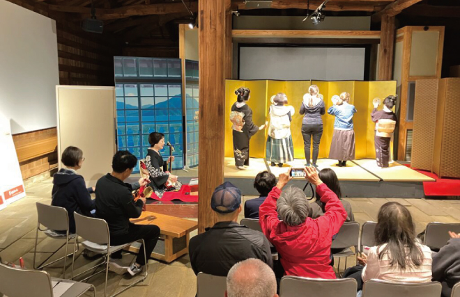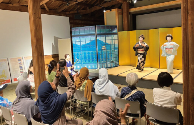 ここでは、長崎検番さんに踊りと唄を披露していただくだけでなく、ご参加いただく方にも太鼓などの演奏を体験していただき、長崎の歴史と文化に触れていただくことができます。