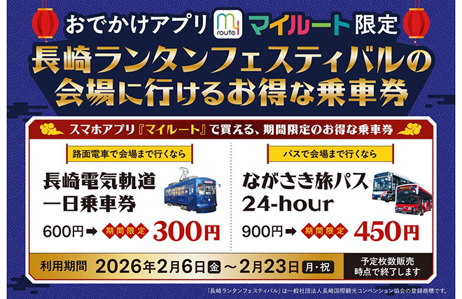 この度「2026長崎ランタンフェスティバル」の実施に合わせて、長崎自動車(長崎バス)と長崎県交通局(県営バス)では、トヨタファイナンシャルサービス㈱が提供するスマホアプリ「my route」で販売中の【長崎市内バス共通24時間フリーパス「ながさき旅パス24-hour」】を半額販売致します!