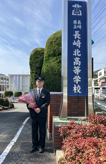 卒業式の前日である2月28日に、長崎北高等学校および長崎北陽台高等学校において、スクールバスを運行している長崎バス運転士に花束をいただきました。