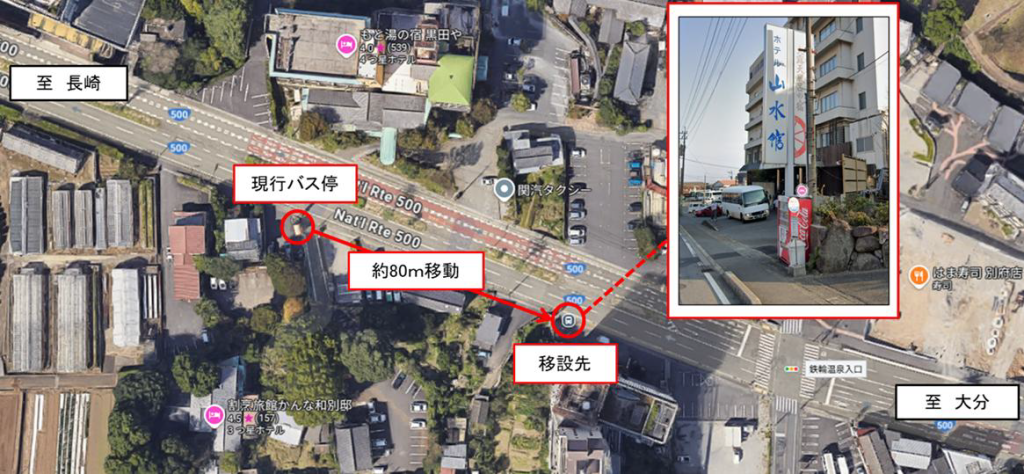 国道500号の道路拡幅工事に伴い、『鉄輪口』バス停(大分線サンライト号・長崎向)を現行バス停から約80メートルほど大分方面へ移設いたします。